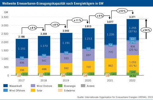 Erneuerbare Energien (EE) erfahren aufgrund ihrer Kostenreduktion, durch technologische Innovationen und zunehmende Akzeptanz seit einigen Jahren einen immensen Kapazitätszuwachs. Mit ca. 80 % des globalen Zubaus sind sie deutlich dominant gegenüber konventionellen Erzeugungsarten – dies stellt eine Verdoppelung im Vergleich zu 2010 dar. Derzeit sind weltweit über 3.000 Gigawatt (GW) an Erneuerbaren installiert. Das entspricht über einem Viertel der weltweiten Stromerzeugungskapazitäten. Der jährliche Zubau beträgt ca. 300 GW. Die installierte Leistung der Windenergie hat sich 2021 gegenüber 2010 mehr als vervierfacht, die der PV-Leistung sogar um den Faktor 21 erhöht. Sowohl hinsichtlich der installierten Leistung als auch der produzierten Strommengen dominiert global weiterhin die Wasserkraft – 2020 waren es noch nahezu 60 %. Diese wird jedoch in den kommenden Jahren aufgrund höherer Zubauraten von der Wind- und Solarenergie überholt werden.