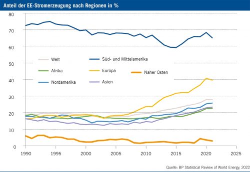 Betrachtet man die regionale Verteilung, so fällt auf, dass sich mittlerweile etwa die Hälfte der Leistung in Asien befindet, gefolgt von Europa mit etwa einem Fünftel und Nordamerika mit etwa einem Siebtel. Zudem verzeichnete Asien im Jahrzehnt von 2012 bis 2021 mit über 200 % Wachstum auch die global größten Zuwachsraten. In Europa waren es im selben Zeitraum etwa 64 % und in Nordamerika etwa 75 %. Aufgrund der hohen Bedeutung der Wasserkraft ist Mittel- und Südamerika mit 70 % derzeit die Region mit dem global höchsten EE-Anteil an der Stromerzeugung. Insb. der Photovoltaik (PV)-Ausbau wird außerdem durch sog. Off-Grid-Kapazitäten im globalen Süden vorangetrieben, die dort einen wichtigen Beitrag zur Energiesicherheit und dem Weg aus der Energiearmut leisten.