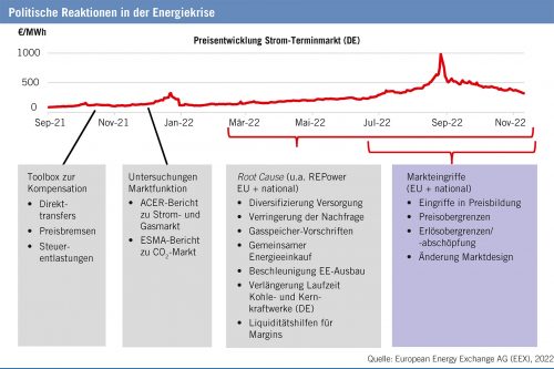 Als Reaktion auf die hohen Energiepreise kam es seit Herbst 2021 in der Europäischen Union (EU) zu zahlreichen politischen Reaktionen und Eingriffen in die Energiemärkte. Zunächst einigte sich die EU-Kommission mit den EU-Mitgliedstaaten im Rahmen der sog. Energie-Toolbox auf Kompensationsmaßnahmen, wie z. B. Steuererlässe und Direktzahlungen an Konsumenten, die die Energiemärkte nicht verzerren. Getrieben durch die Preisentwicklung infolge des Russland-Ukraine-Konflikts hielt die politische Debatte über die Funktionsweise der Energiemärkte und weitere Markteingriffe das gesamte Jahr 2022 über an.