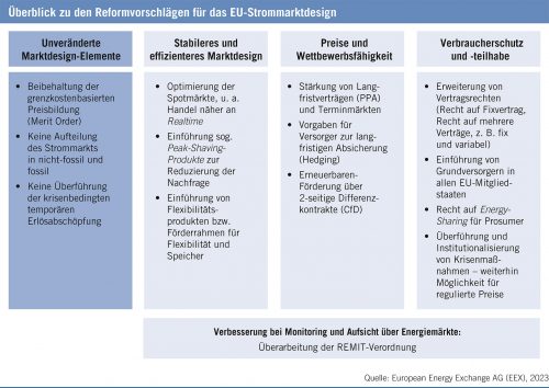 Unter dem Eindruck der Energiekrise entwickelte sich auch eine Debatte über strukturelle Reformen des Strommarktdesigns. Als vorläufiges Ergebnis hat die EU-Kommission einen entsprechenden Vorschlag für ein Reformpaket vorgelegt. Ziele der Reform sind, den EU-Strommarkt so weiterzuentwickeln, dass ein beschleunigter EE-Ausbau, eine verringerte Abhängigkeit von Gas, ein besserer Schutz von Verbrauchern vor Preisschwankungen und Preisspitzen und eine bessere Wettbewerbsfähigkeit der EU-Industrie erreicht werden. Zentrale Elemente des Marktdesigns, wie die grenzkostenbasierte Preisbildung (Merit Order-Prinzip), sollen dabei beibehalten werden. Stattdessen soll das Marktdesign punktuell weiterentwickelt und ergänzt werden, um den Strommarkt robuster und effizienter zu machen.