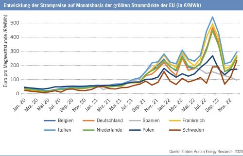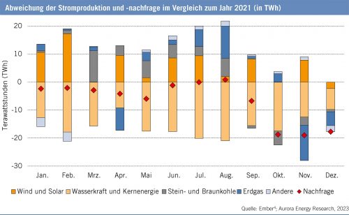 Die Gesamtstromproduktion in der EU im Jahr 2022 belief sich auf 2.795 TWh. Mit 1.616 TWh entfiel mehr als die Hälfte (58 %) der Stromerzeugung auf die vier Mitgliedstaaten Deutschland, Frankreich, Spanien und Italien. Der Anteil der Erneuerbaren an der Gesamtstromerzeugung lag bei 38,6 % (2021: 37,3 %). Zum ersten Mal lag der Anteil von Wind- und Solarstrom an der Gesamterzeugung in der EU mit 22,3 % über jenem der Erdgasverstromung (19,9 %).