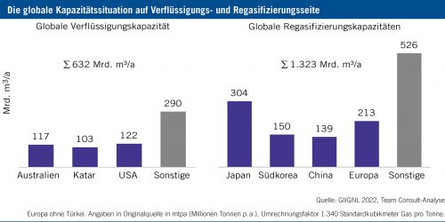 Eine Ausweitung des LNG-Angebots ist nur durch zusätzliche Verflüssigungsterminals und eine entsprechende Ausweitung der Erdgasförderung möglich. Wegen der langen Planungs- und Bauzeiten von Verflüssigungsterminals gibt es hier eine Vorlaufzeit von mehreren Jahren, bevor neue Terminals gebaut sind und in Betrieb gehen können. Bei einer Betrachtung der großen drei Exporteure (USA, Katar und Australien) zeichnet sich ab, dass, außer bei den USA, eine Ausweitung der Exportkapazität erst für die Jahre ab 2025 zu erwarten ist. Der LNG-Markt wird daher zumindest bis 2025 angespannt und LNG ein knappes Gut bleiben.