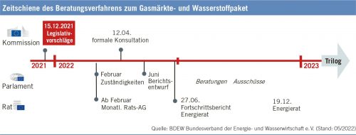Die russische Invasion in die Ukraine im Frühjahr 2022 macht einerseits deutlich, wie wichtig ein zukunftsfähiger Regelungsrahmen für den Gas- und Wasserstoffsektor ist. Ein rascher Hochlauf der H2-Wirtschaft trägt nicht nur dazu bei, die EU-Klimaziele zu erreichen, sondern kann auch der Diversifizierung der Lieferquellen der EU und ihrer Mitgliedstaaten dienen. Es wird damit jedoch gerechnet, dass die Trilog-Verhandlungen zwischen Rat, Parlament und Kommission zum Gesetzespaket erst im kommenden Jahr begonnen und die Gesetzgebungsverfahren voraussichtlich erst in der zweiten Jahreshälfte 2023 abgeschlossen sein werden.