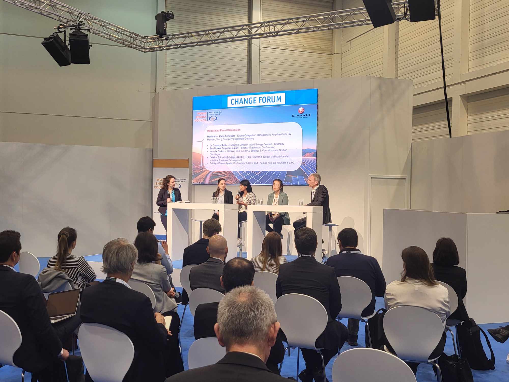 Bei der E-world 2024 veranstaltete der Weltenergierat – Deutschland eine Podiumsdiskussion zu Innovationen in der Energiewende. Weltenergierat-Geschäftsführer Dr. Carsten Rolle eröffnete die Diskussion mit einen Impulsvortrag zu globalen Trends der Energiewende und der Bedeutung von Wasserstoff und Ammoniak bei der Ökologisierung von Molekülen. Es folgten Pitch-Präsentationen von drei Start-Up-Unternehmen des Energiesektors: Heatrix GmbH (Wei Wu , Co-Founder und Strategy & Operations), Celsius Climate Solutions GmbH (Mathilde de Mazière, Business Development) und Gridty GmbH (Pavani Aysola , Co-Founder & CEO). Bei der anschließenden Diskussion wurden unter anderem folgende Fragen diskutiert: Was ist erforderlich, um vielversprechende Technologien zu beschleunigen und zu skalieren? Auf welche regulatorischen oder sonstigen Hindernisse stoßen Sie? Wie wirkt sich das aktuelle Investitionsklima auf die Finanzierung von Innovationen aus?